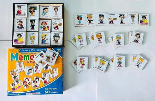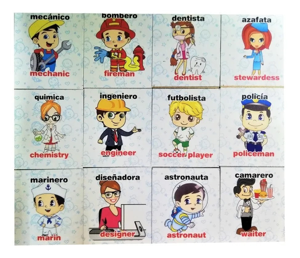 Memorama de madera de Oficios y profesiones 60 pz, Español -Ingles, Fabricado en MDF de 4 mm. cada pieza mide 5 x 5.5 cm. Edad recomendada a partir de 3 en adelante