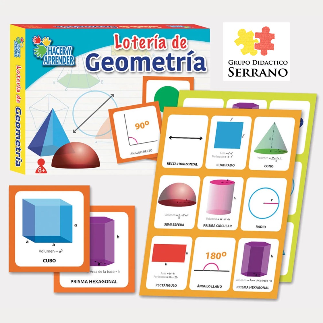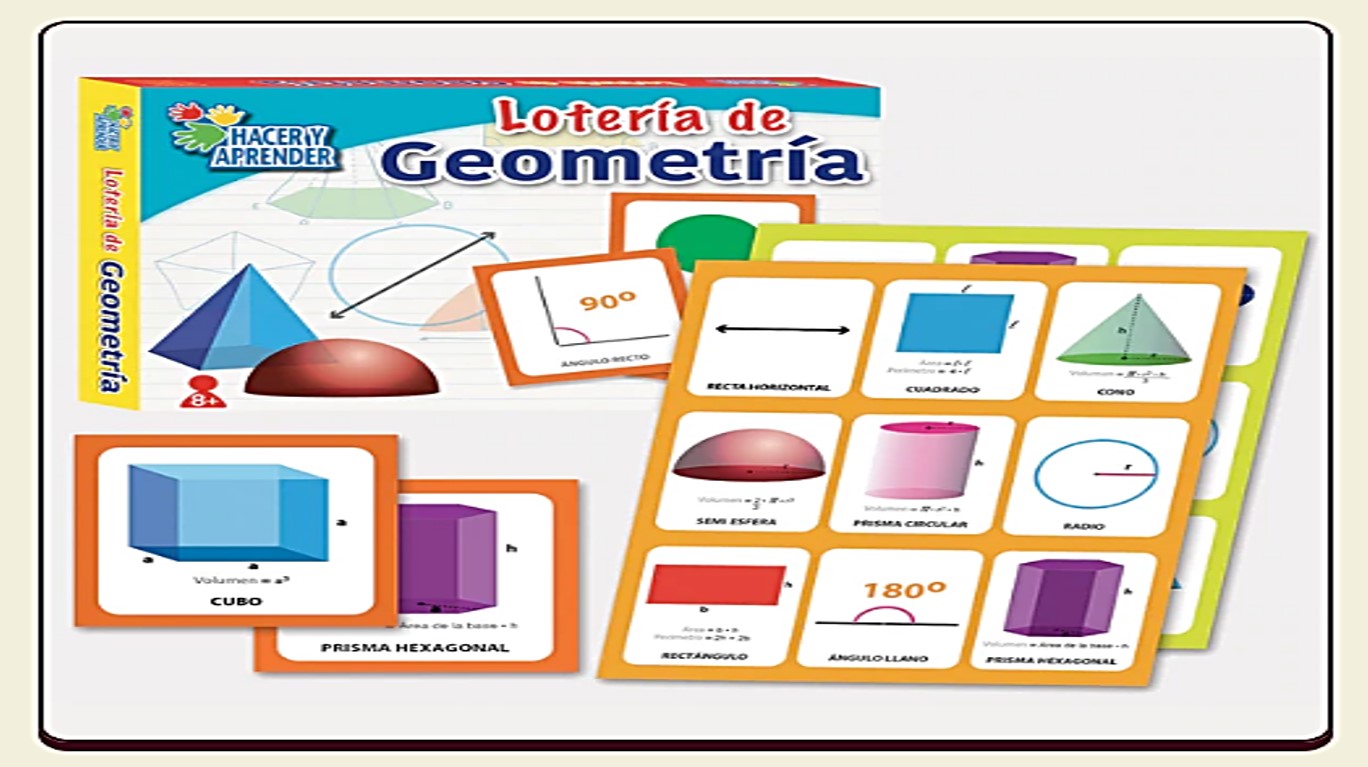 Lotería de Geometría, La implementación de la geometría al juego tradicional de lotería permite estimular la percepción visual, auditiva y espacial, ayuda a la coordinación motriz, trabaja con el desarrollo de la inteligencia, Además este material le permite al niño adentrarse al mundo geométrico  conociendo y aprendiendo todo lo que conllevan las figuras geométricas. Presentación: 16 tableros, 35 tarjetas y 120 fichas.